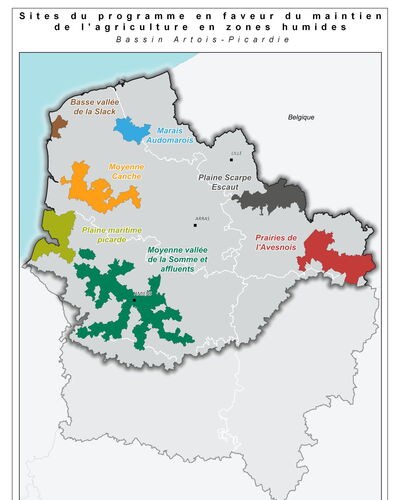 Or, la conservation des prairies est fortement dépendante du maintien de l’élevage. Pour ce faire des programmes d’accompagnement sont portés à l’échelle du Bassin Artois-Picardie, notamment le programme de maintien de l'agriculture en zones humides (PMAZH).